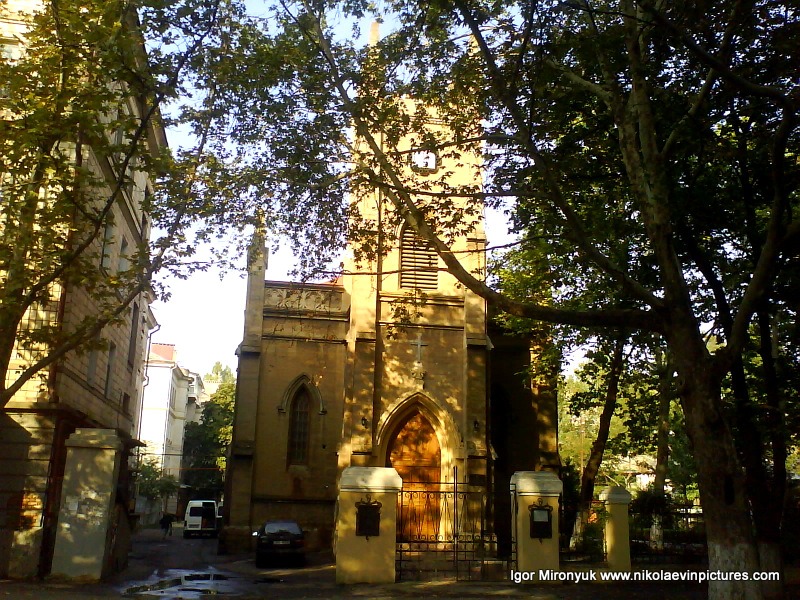 Построена в 1852г. в духе типичной английской псевдоготики: башня-колокольня, стрельчатые окна, короткие шпили, готический портал.