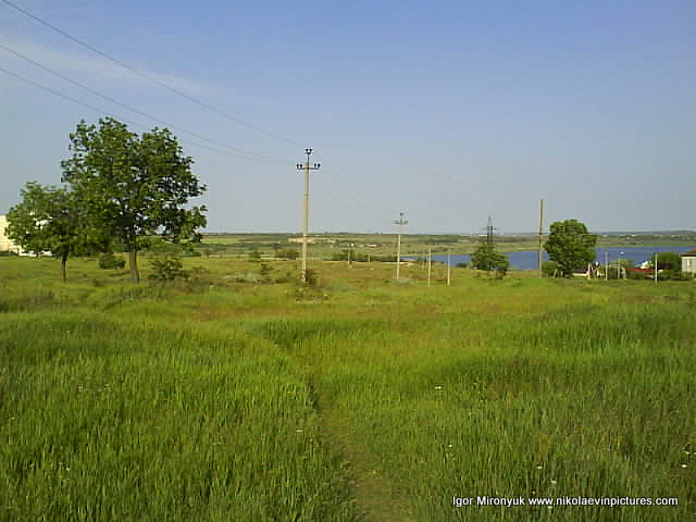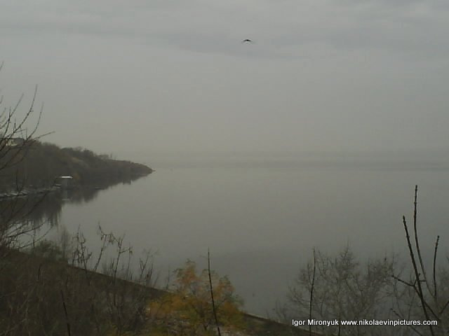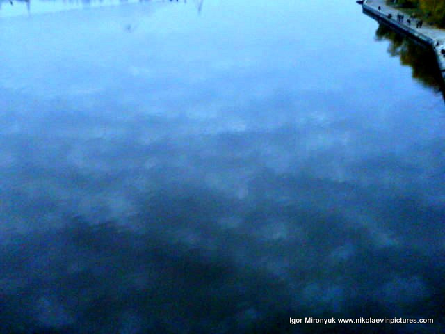 На фотографии синее над синим, небо с где-не-где длинными облаками, уходящими вдаль, которые скоро сотрутся с нашего кругозора над ещё более синим бассейном Ингула, который придаёт этой фотографии более привлекательный вид.