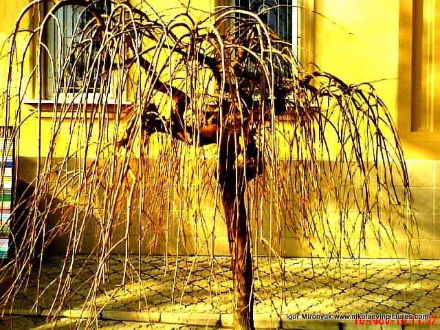 Итак, что касается фотографии, то как видите, стоит себе деревцо в знойную жару, не высокое на рост, без листьев, с опущенными чуть ли не до земли ветками, похожими на волосы, декоративной шелковицы. Оно, опуская свои тонкие ветки (волосы) вниз, как будто “плачет”.