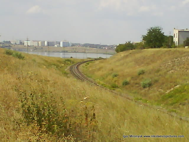 Полуостров Аляуды в Николаеве. Аляуды закагчиваются. Железная дорога поворачивает направо, а вдали видно Северный и Порожнечу.