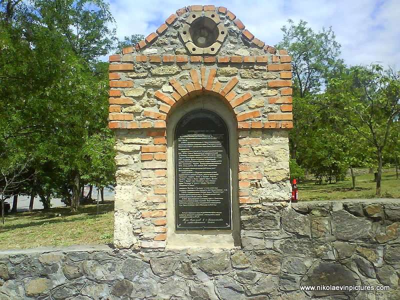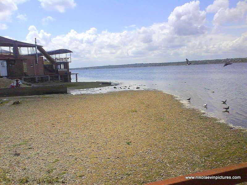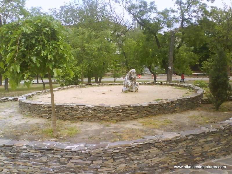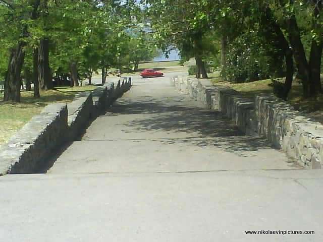 Аккуратно сложенный кирпич, левее зелёная лужайка, высокие и могучие берёзы, ещё левее тротуар и жилые здания, за ними дворы. На заднем фоне фотографий видно воду. Это Бугский лиман.