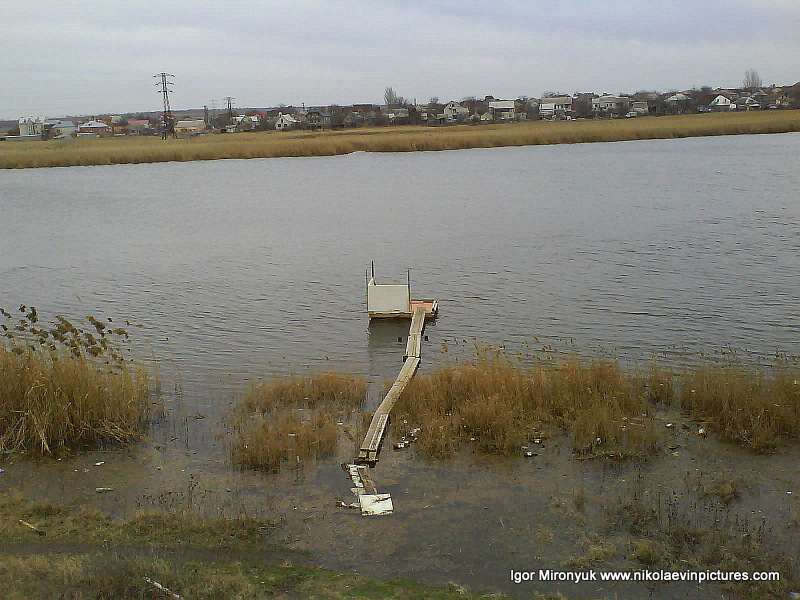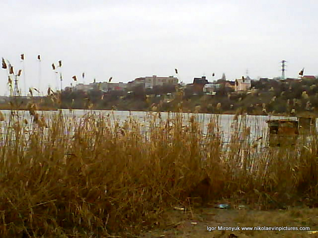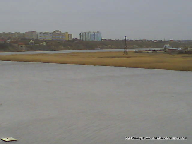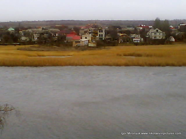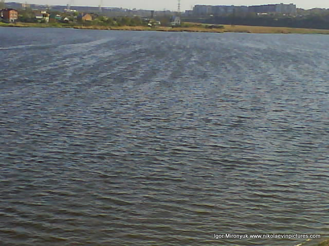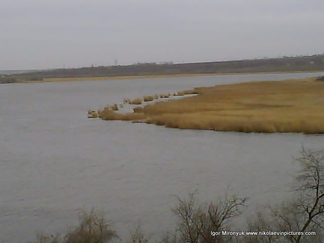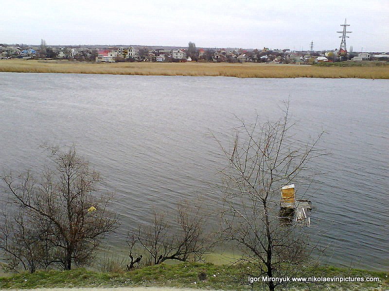 На первой фотографии, как вы видите на заднем плане, Николаевская область, потом видны дома на полуострове Ракетное Урочище, а на переднем – река (кстати тёмная линия на воде – это волна) и широкая область камышей с закрытыми водоёмами.