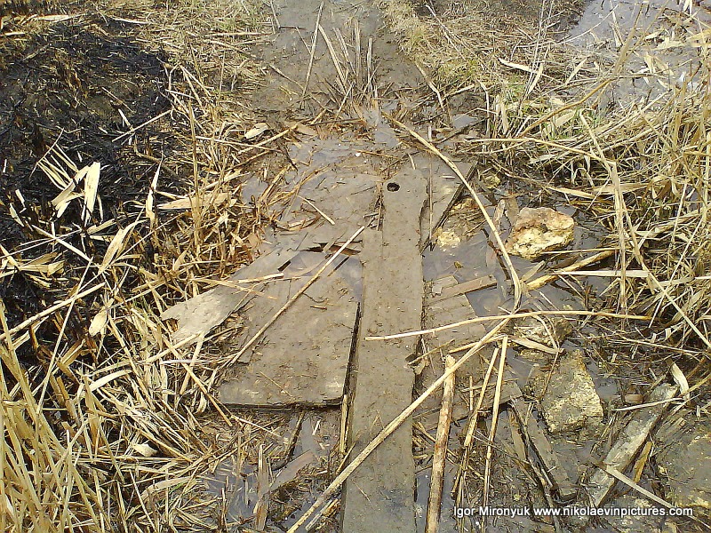 Упавшие камыши, доски, вот так я прошёл через воду. Впервые такой проход через воду мне попался на моём пути.