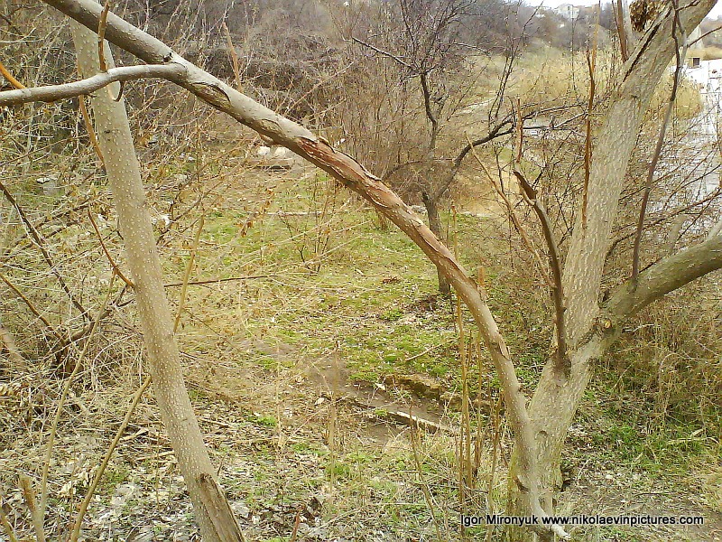 Возле забора, где была равнина, растут молодые деревья, не толще обычной палки. Сгусток вот таких деревьев. А возле этого сгустка на земле лежала поваленная сухая ветка. Но, это мне не стало преградой; я ринулся в него, проникая сквозь деревья. Места мало, которое заняли деревья, а дальше спуск.