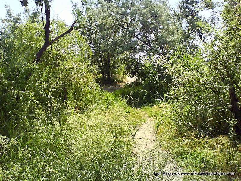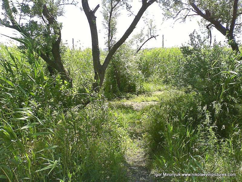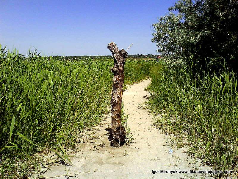 Пройдя ещё с десяток метров, я увидел зелёный ряд из камышей, занимающий почти всю косу в ширину. В середину вела тропа, по которой я, не раздумывая, пошёл. Дальше тропа разделяется. Вторая ведёт вправо.